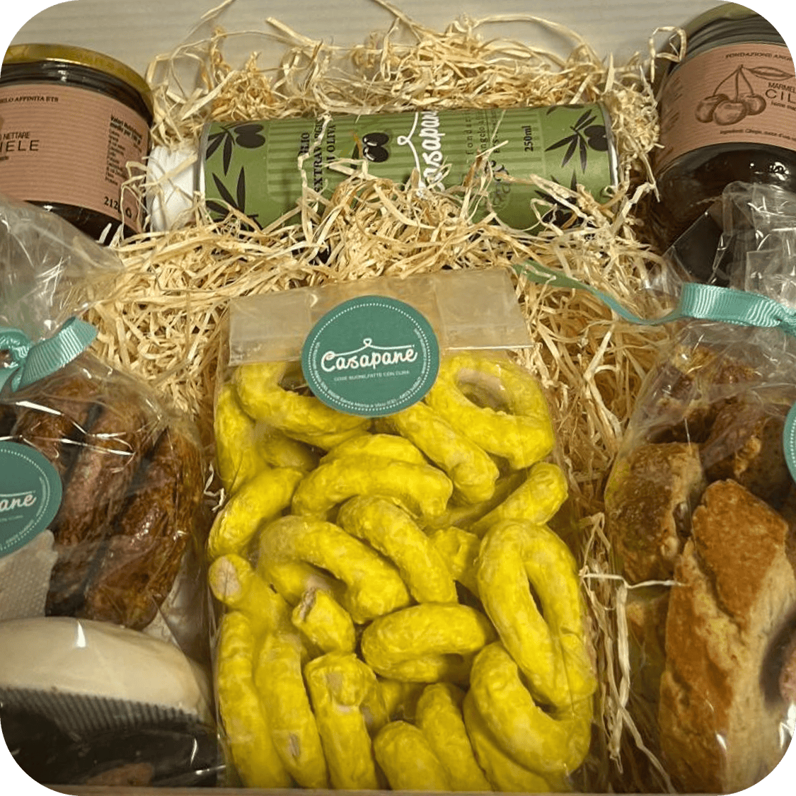 Regala il gusto del Natale tra miele bio, olio extravergine di oliva, marmellata di ciliegie, roccocò, mustacciuoli, tarallini glassati al limoncello e cantuccini.